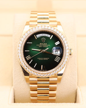 Rolex Day-Date 40 Green Ombre Presidential Diamond Bezel 228348RBR Factory Stickers